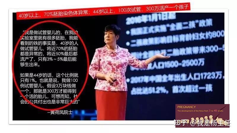 我們國內有個非常知名的院士,就是上海國婦嬰的黃荷鳳院士,她講了一個非常有名的觀點:如果一個人44歲了,她做試管嬰兒的活產率只有1%。如果按照一次3萬塊錢,理論上來說要做100次,也就是說花300萬才能得到一個孩子,這個社會成本非常高。因為女性到40歲以上,染色體很多都是異常的,產子確實非常難成功。